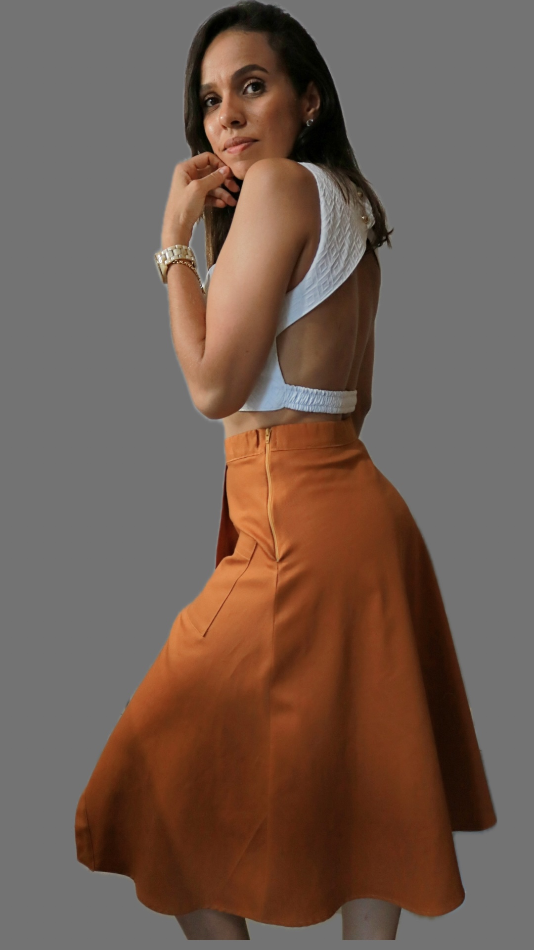 A saia Dália é uma peça diferenciada, estilosa, que combina tanto para o verão em tecidos como viscose sarjada, linho, cambraia, algodão, brim leve, tanto para o inverno em tecidos mais pesados como veludo cotelê, sarja mais encorpada, lã. Onde também te permite criar variações do modelo alternando o comprimento da peça.
